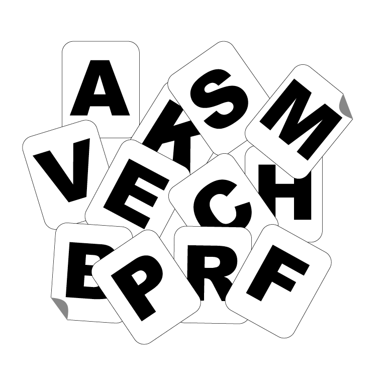 Autocollants avec coins arrondis fond blanc impression noir. De plus les lettres autocollantes ont un pelliculage transparent pour protéger des rayures et des rayons UV du soleil