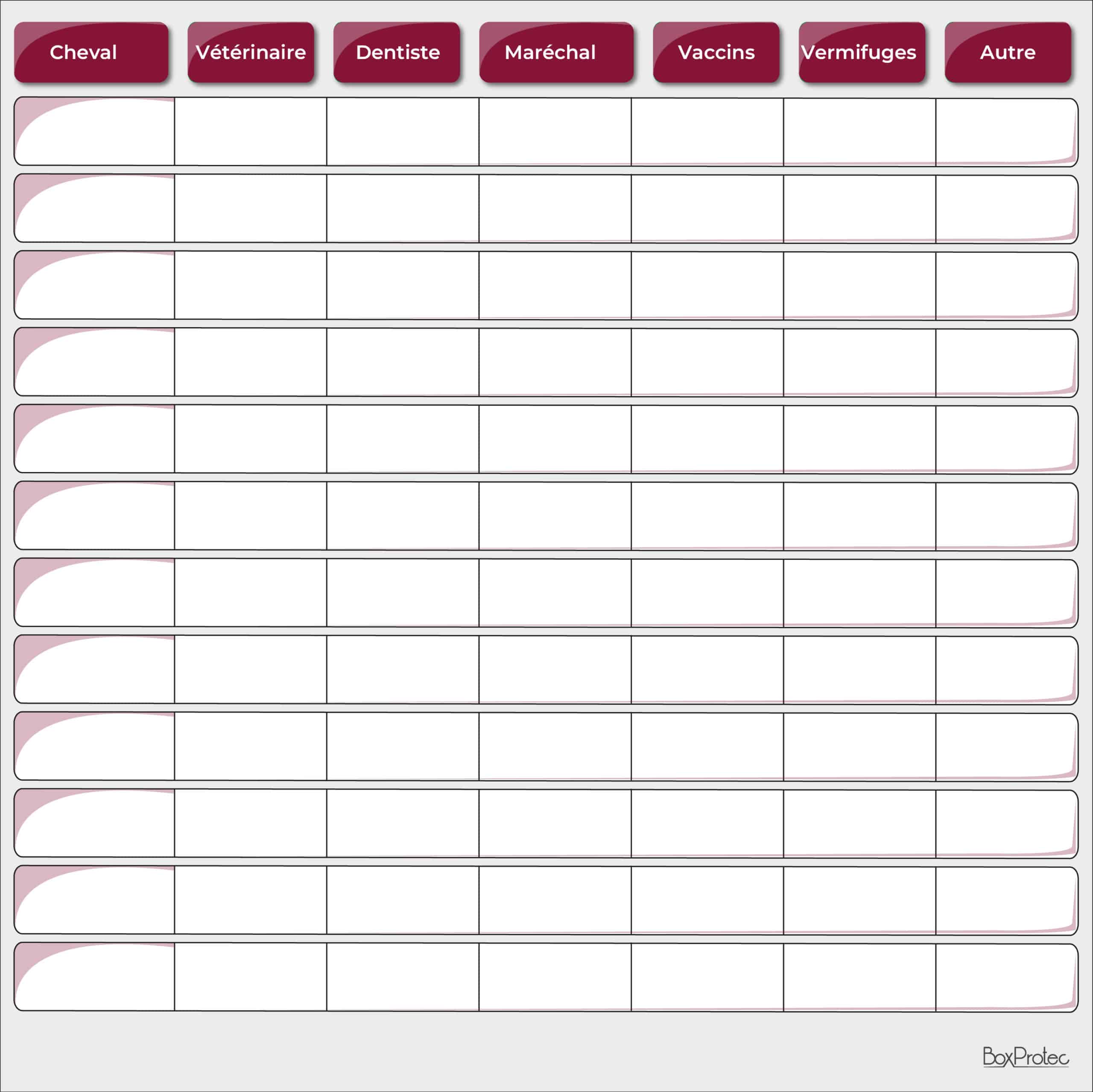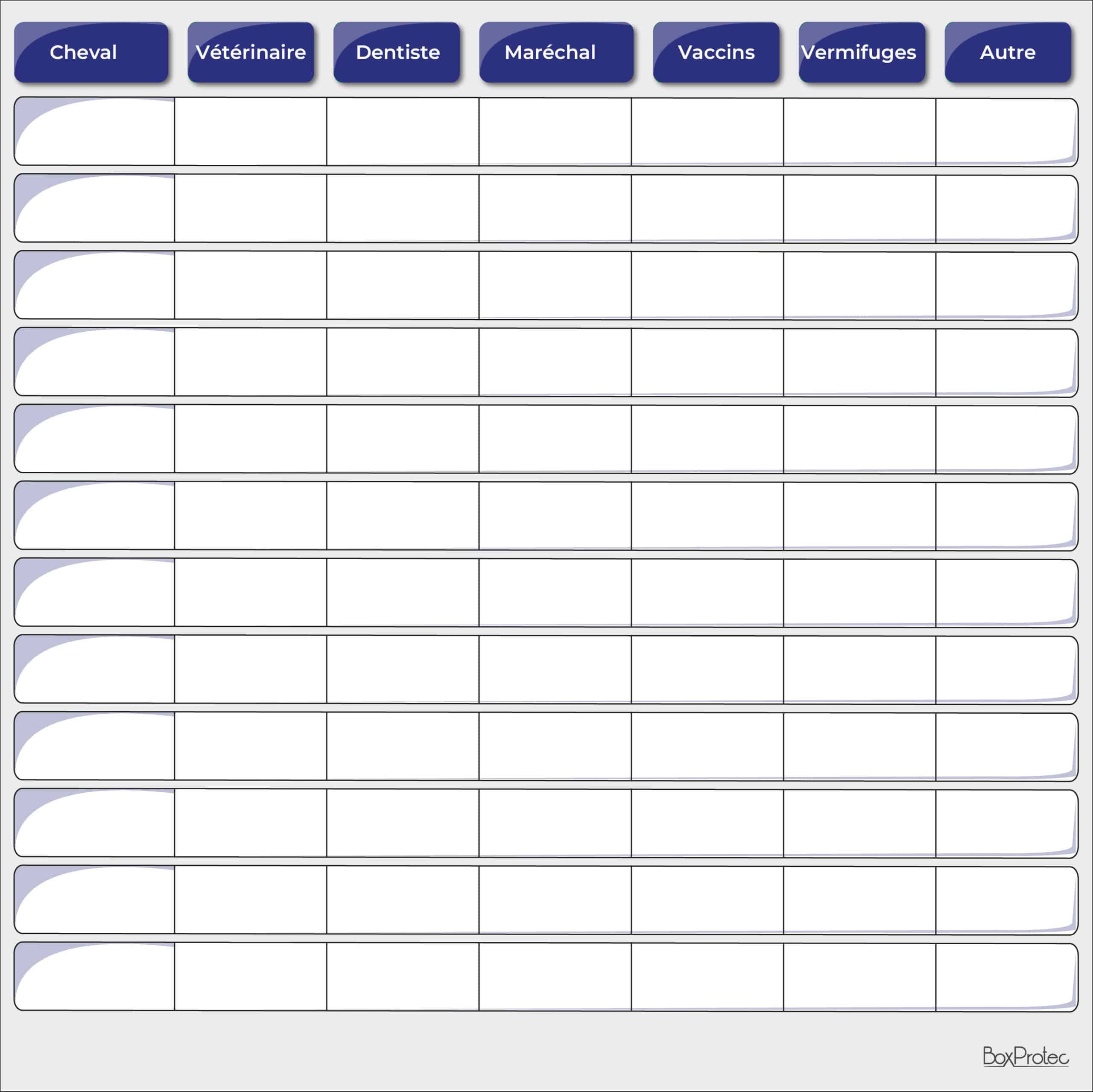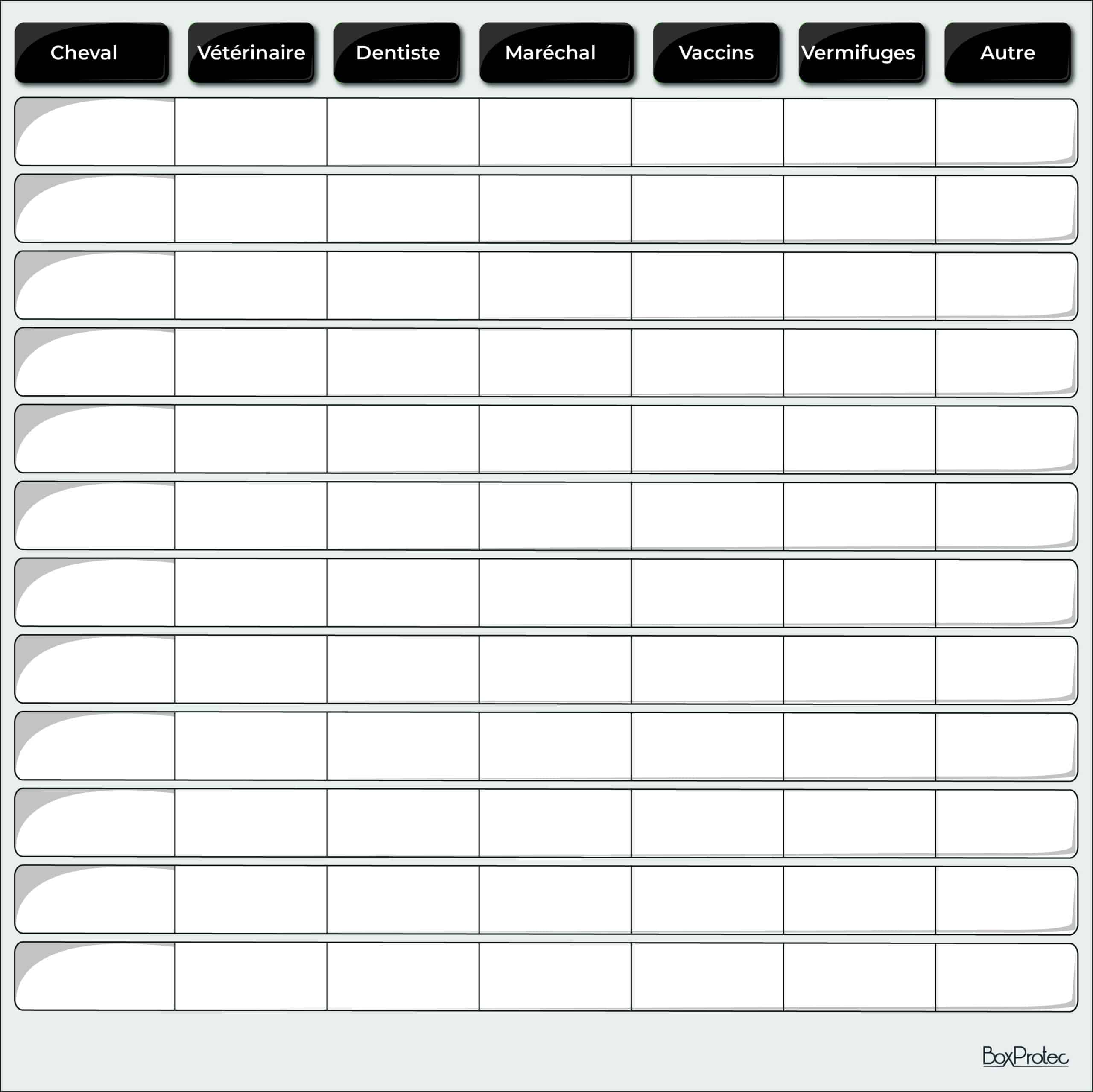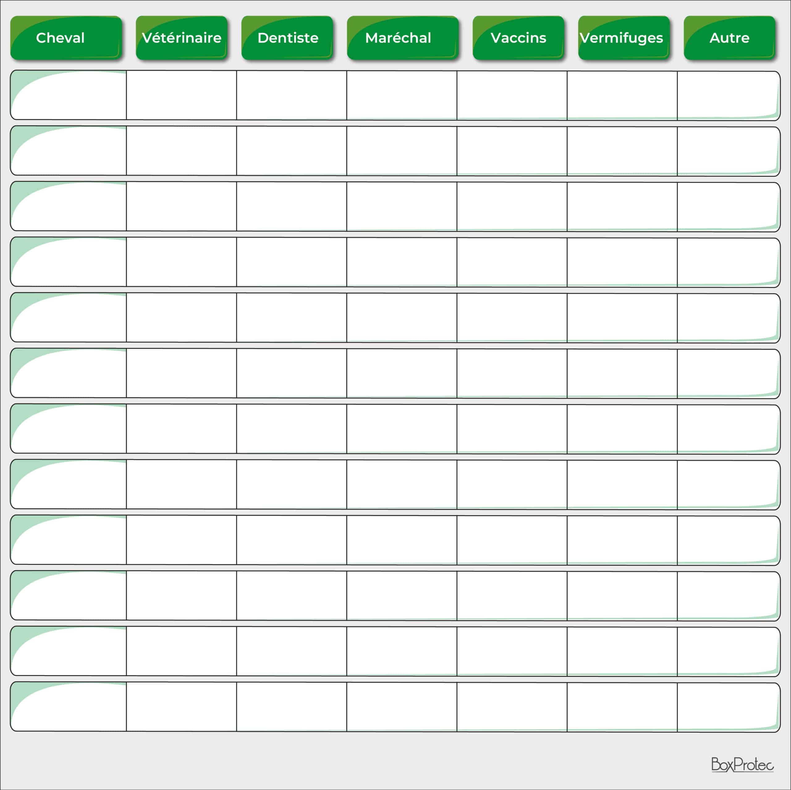 Ce tableau vous permet de suivre de près les soins de chacun de vos chevaux. Notez leurs noms, les dates des prochains vaccins, vermifugations, visites du dentiste ou du maréchal-ferrant. Vous pouvez également ajouter des notes sur des soins spécifiques comme les séances d’ostéopathie ou les traitements particuliers.