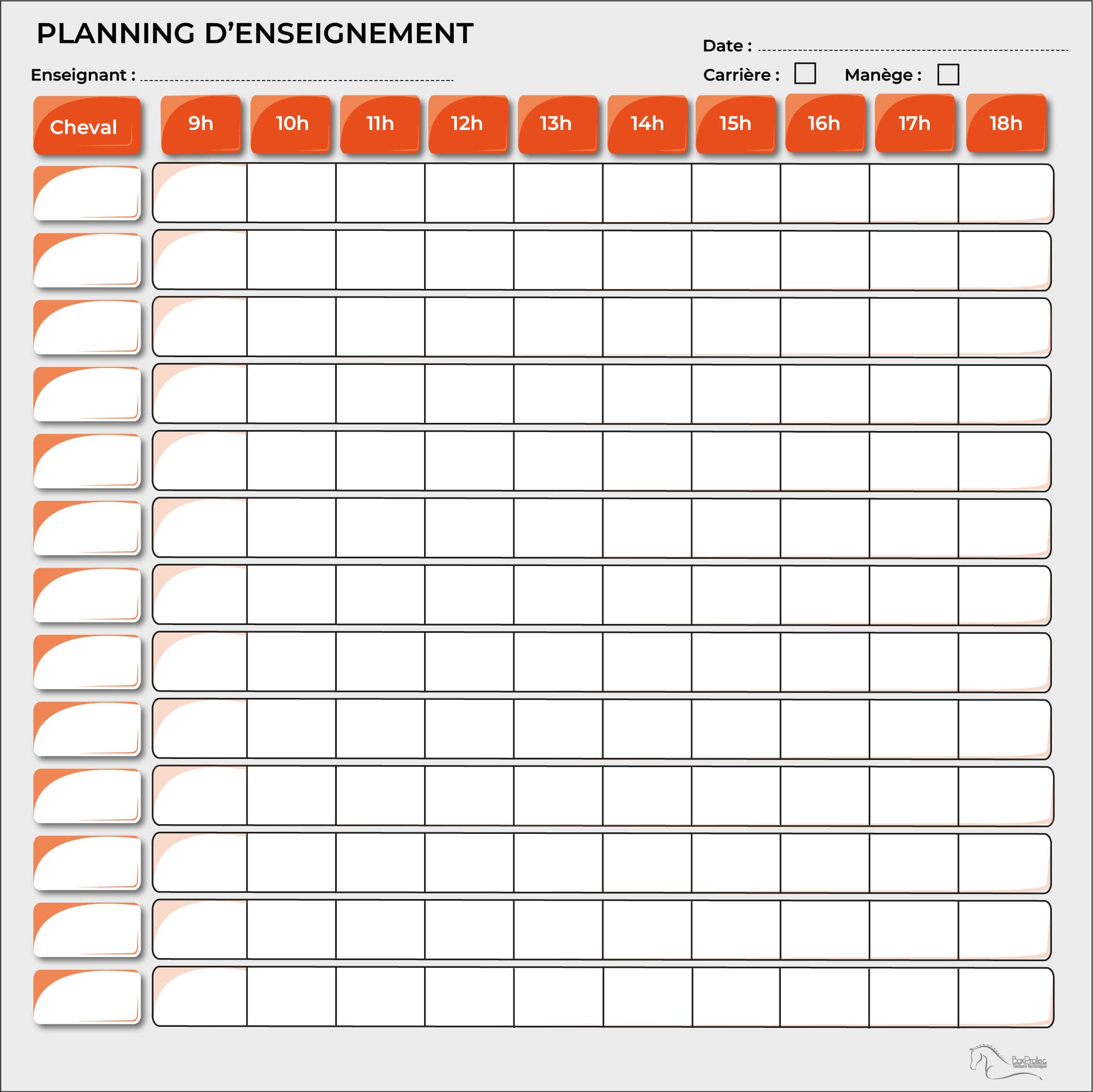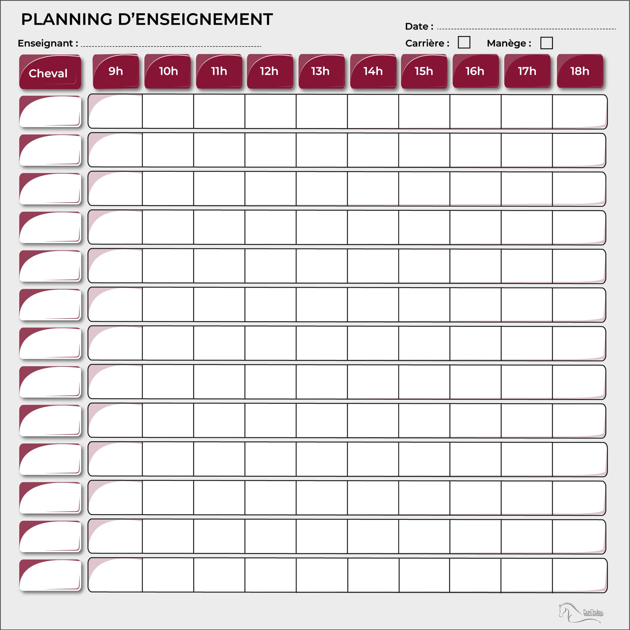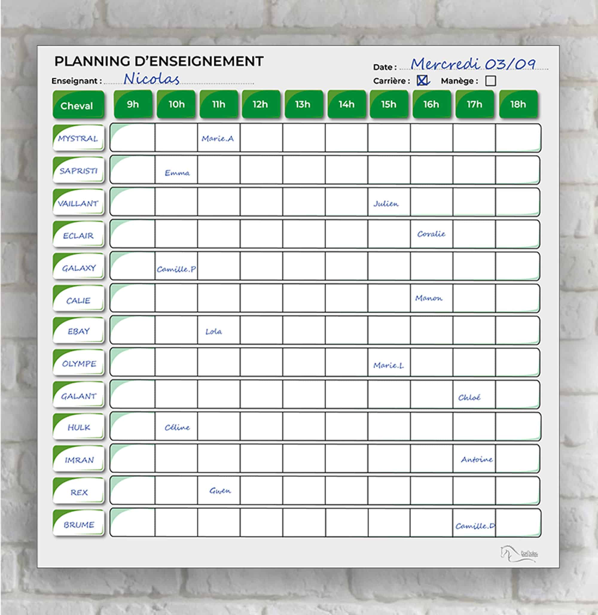 Planning d’enseignement d’équitation effaçable pour chevaux