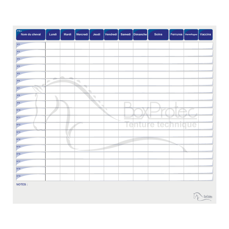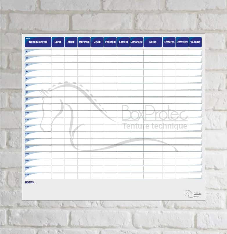 Ce planning, entièrement effaçable, vous aide à organiser facilement et individuellement les directives pour les soins de chaque cheval.