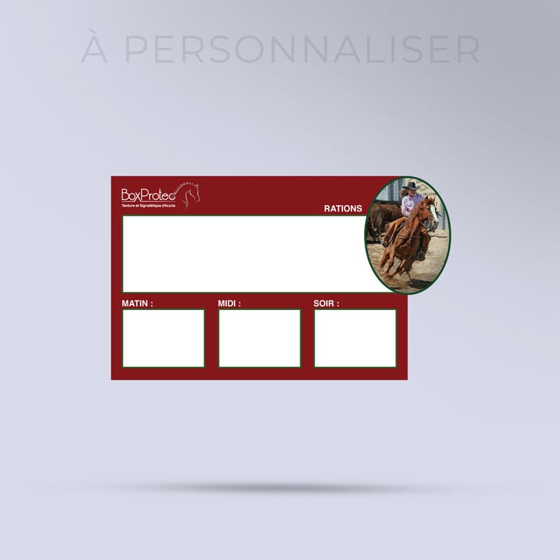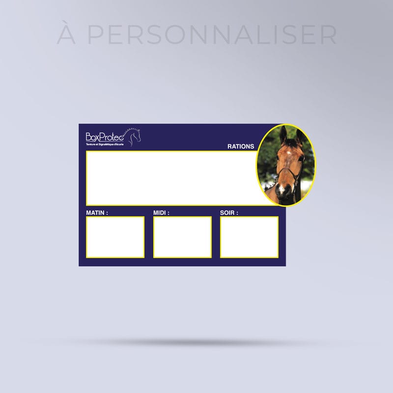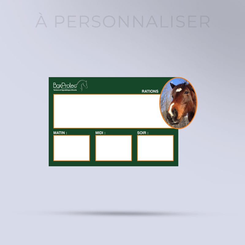 Simplifiez la gestion quotidienne de votre écurie avec une plaque de ration personnalisée ! Idéale pour afficher les informations essentielles sur les repas de vos chevaux. Parfaite pour les clubs ou écuries privées où les chevaux restent les mêmes, cette plaque permet d’apporter clarté et organisation tout en ajoutant une dimension visuelle grâce à la possibilité d’y intégrer une photo : votre cheval, une photo de vous avec lui, ou un autre visuel significatif.