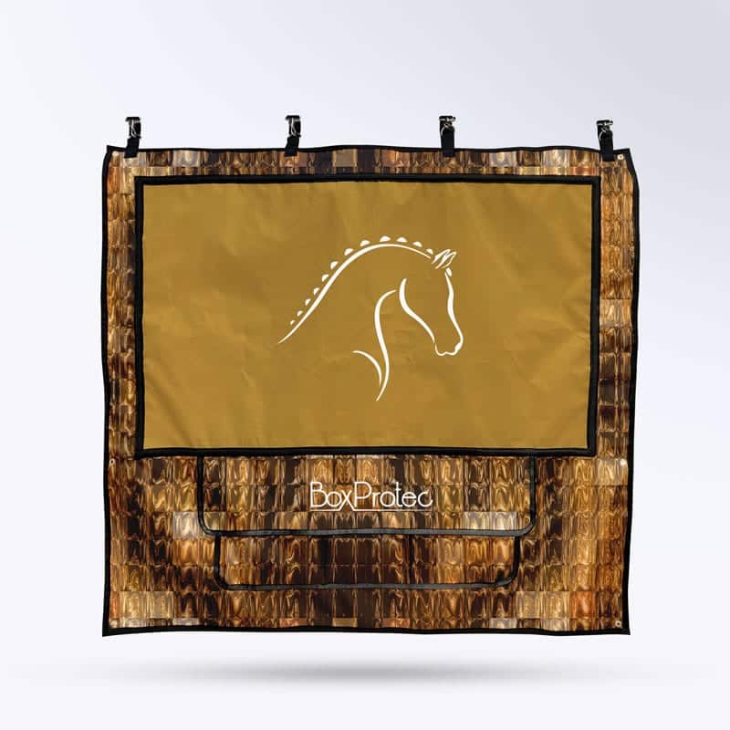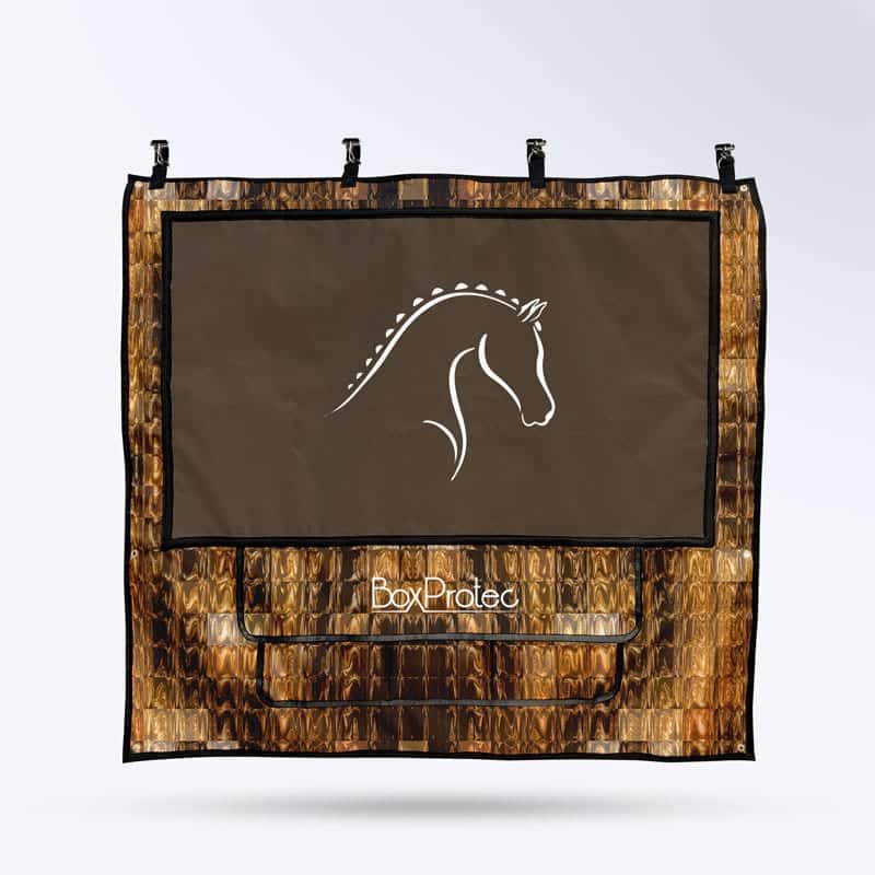La tenture BoxProtec est composée d’une toile en PVC résistante de 650gr/M2. Idéal pour les grooms, 3 pochettes de rangement sont intégrées en façade pour ranger vos flanelles, bandes, brosses, guêtres et accessoires de grooming…. Fidèle à nos valeurs de confort pour le cheval, nous y avons intégré une toile micro-perforée pour garder les caractéristiques de la tenture standard. Elle protège donc du vent, du soleil et de la pluie, tout en laissant passer la lumière et permet à votre cheval, poney de voir sans être vu !